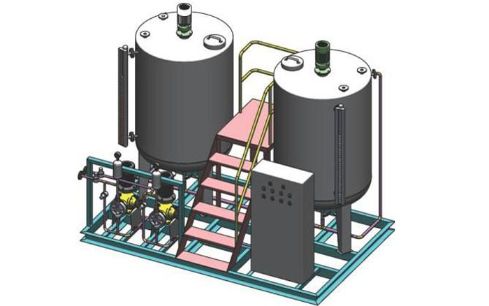 本裝置主要包括藥液計量泵系統(tǒng)、溶配系統(tǒng)、計量投加系統(tǒng)、安全系統(tǒng)和控制系統(tǒng)等五部分。