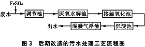 ③ 對這種高濃度呈強堿性的印染廢水,在生化前要進行中和。硫酸亞鐵對這類印染廢水有獨特作用,預處理采用投硫酸亞鐵的辦法,能去除部分色度,并且能使COD降到900mg/L以下。