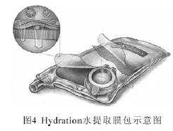 Hydration 水提取膜包是目前僅有的幾個(gè)正滲透技術(shù)商業(yè)化應(yīng)用之一。當(dāng)飲用水缺乏時(shí)用于從臟水中獲得飲用水。其結(jié)構(gòu)如圖4 所示,由正滲透膜做成一個(gè)密封的包,里面放有可食用的汲取溶液(糖類和飲料粉未)[25]。當(dāng)把這種膜包浸入臟水中時(shí),水在滲透壓作用下擴(kuò)散進(jìn)入膜包,稀釋的汲取溶液就是可飲用的水溶液。由于這一過(guò)程不需要外加能源,得到的水沒(méi)有生物和外在有機(jī)物的污染,特別適用于野外救生和軍事應(yīng)用。