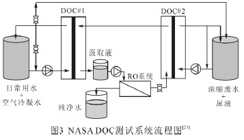 空間站和星際旅行都需要對(duì)水進(jìn)行處理和循環(huán)利用。太空任務(wù)中可回收的水源有日常用水,尿液和空氣水分。美國(guó)宇航局(NASA)聯(lián)合Osmotek 公司開(kāi)發(fā)了直接滲透濃縮系統(tǒng),即DOC 系統(tǒng)用于太空任務(wù)中的水處理和循環(huán)利用[22-23]。比較初的DOC 測(cè)試系統(tǒng)處理流程如圖3 所示,包括一個(gè)反滲透處理系統(tǒng)和2 個(gè)DOC 預(yù)處理子系統(tǒng),一個(gè)是正滲透過(guò)程、另一個(gè)是正滲透與膜蒸餾結(jié)合過(guò)程(用于分離尿素和尿酸類物質(zhì)),采用氯化鈉驅(qū)動(dòng)溶液將廢水濃縮后,利用反滲透從稀釋的汲取液中分離得到純凈水。